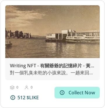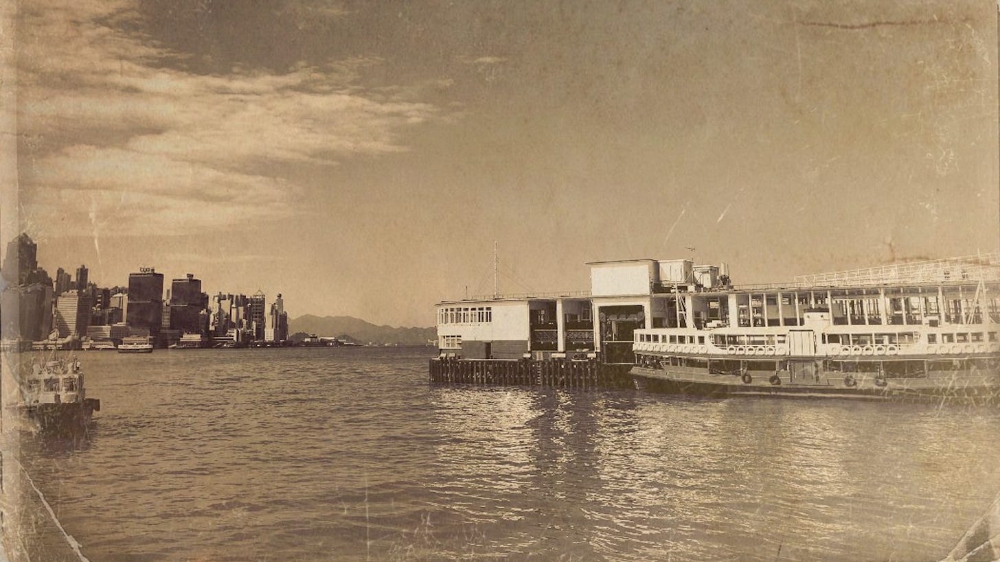 那是碧綠色的海水,是那種讓人無法看透的墨綠,卻比翡翠更柔滑。海浪的波紋把海面分割成無數個形狀不規則的小格子,像一杯吃到一半的青檸味啫喱,小輪的螺旋槳令水面生出白色泡沫狀的浪花,為啫喱添上幼滑的花奶。我和爺爺在往返佐敦及中環的渡輪上,我聞到海水的䶢味,皮膚感到刮面的海風,耳朵聽到震耳欲聾的引擎響聲。我把頭稍稍伸出船艙則的圍欄外,好奇地東張西望,一時遠眺對岸一棟棟如積木般的摩天大廈,一時凝視那陽光下的綠水,或指著海港穿梭的各式船隻嘩然叫好。那時紅磡海底隧道可能還未開通,所以小輪分上下兩層,上層供人乘坐,下層則載欲過海的車輛。當船隻靠岸,船上的水手會如西部牛仔般把粗繩索拋向碼頭的水手以把船身繫上碼頭,經過船身碰撞碼頭圍欄那刺激的剎那,懷着滿心期待等候跳板被放下,並像在遊樂場的攀爬設施遊玩般小心奕奕地走過那搖搖晃晃的跳板。身材矮小的我拖著爺爺的手,登岸後隨著眼前密密的乘客屁股都散去後豁然開朗,到達貌似比我居住的社區優雅得多的中環。